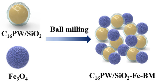 Ionic liquid [C16mim]3PW12O40 (C16PW) was synthesized according to the previous report [58]. In a typical process, 0.3 g of C16PW was dissolved in 4 mL of acetonitrile with continuous stirring. The above solution was dropwise added to 26 mL of deionized water at 30 °C under stirring for 10 min. Subsequently, 2 mL of TEOS and 0.5 mL of aqueous ammonia was dropwise added to the above mixture. After stirring for 3 h, the resulting solution was dried at 50 °C overnight to obtain the supported ionic liquid C16PW/SiO2. Finally, C16PW/SiO2 was mechanically milled with magnetic Fe3O4 (1 wt.%) with a rotation speed of 200 rpm for 3 h to obtain C16PW/SiO2-Fe-BM (Scheme 1). For comparison, supported ionic liquid C16PW/SiO2 without Fe3O4 is obtained with the same ball milling method and is denoted as C16PW/SiO2-BM.