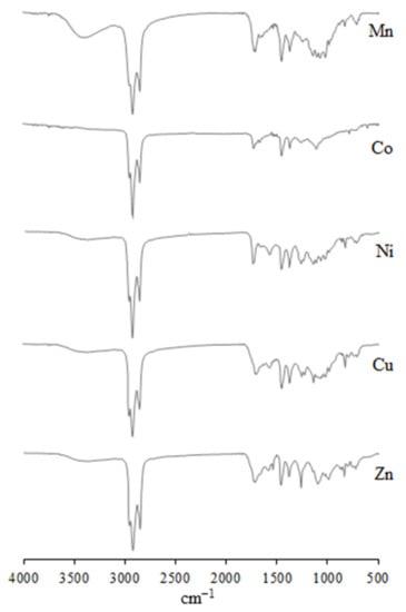 FT-IR spectra of synthesized petroleum metalloporphyrins.