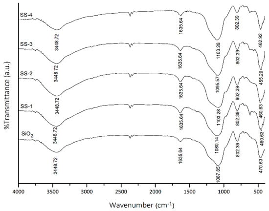 FTIR spectra of SiO2, SS-1, SS-2, SS-3, and SS-4 catalyst. SS = Sulfated silica.