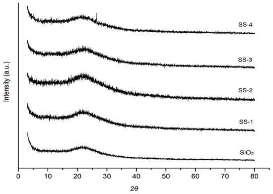 XRD diffraction of SiO2, SS-1, SS-2, SS-3, and SS-4 catalyst. SS = Sulfated silica.