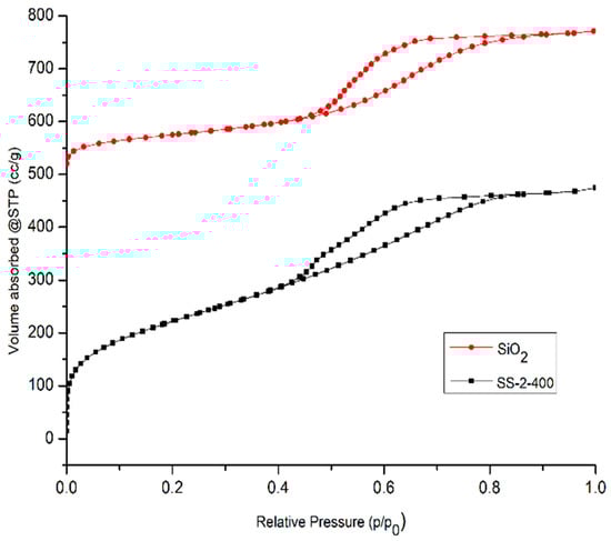 The N2 adsorption–desorption isotherm curves are shown in Figure 7. Based on IUPAC isotherm type, the SiO2 and SS-2-400 catalysts have an isotherm type of IVa accompanied by a type H4 hysteresis loop, confirming that both catalysts are mesoporous materials. The H4 hysteresis loop also confirms the presence of a narrow slit-like pore and the filling of micropores [32].