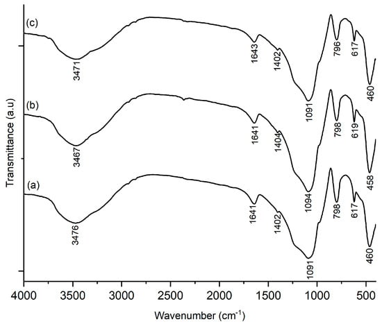 The infrared spectra of the SO4/SiO2 catalysts from the variations in H2SO4 concentration are shown in Figure 1. The absorptions at the wave number 460 and 815 cm−1 show the bending and symmetrical stretching vibrations in the Si-O-Si groups. The broad absorption band at 3600–3000 cm⁻¹ represents the stretching vibration of the -OH group from silanol groups (Si-OH) [21]. Meanwhile, the bending vibration of the -OH group of silanol originated from the water molecule as confirmed through absorption at 1600 cm⁻¹. The absorption at 1100 cm⁻¹ shows the asymmetric stretching vibrations of the Si-O-Si groups overlapping with the stretching vibration of the S-OH from the HSO4⁻¹ ion [22].