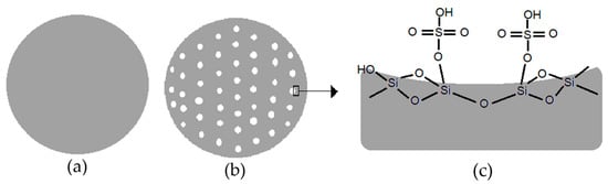 Illustration of (a) non-porous silica catalyst; (b) porous silica catalyst, and (c) surface of sulfated silica catalyst.
