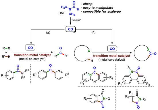 As described in Section 2.2, some examples of carbonylative protocols involving DMF as a CO surrogate were also carried out in the presence of a nickel catalyst, which is often used as a low-cost alternative to palladium catalysts in the context of carbon–carbon bond formation reactions. Although these studies were only applied to the synthesis of carbonyl-containing acyclic compounds, they clearly indicated the possibility of some applications of nickel species as efficient catalysts in the context of metal-catalyzed carbonylative cyclization involving DMF as a CO surrogate.