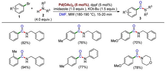 The use of DMF as a formal source of carbon monoxide in carbonylation reactions for the synthesis of carbonyl-containing molecules has been reported, in most cases, in the presence of a palladium catalyst. The first study in this context was reported in 2002 by Hallberg, Alterman et al., who described the aminocarbonylation of aryl bromides with amines, in the presence of DMF as a CO surrogate [28]. Reactions were performed by treatment of aryl bromides 1 with 4.0 equiv. of a primary or secondary amine 2, in the presence of Pd(OAc)2/dppf (5 mol%) as the catalytic system, imidazole (1.0 equiv.) as an additive and potassium t-butoxide (1.5 equiv.) as a base, under microwaves irradiation in DMF, acting as both solvent and reagent (Scheme 2). The substrate scope of this first work was quite limited: On one hand, the protocol was only applied to aryl bromides 1 bearing electron-rich groups (Me, OMe) in the ortho- or para-position, while it failed with electron-deficient substrates; on the other, only benzyl amine, aniline and morpholine were tested as the other coupling partner. However, the aminocarbonylation products 3 were obtained in good yields (76–94%) after very short reaction times (15–20 min), mainly thanks to the use of microwaves as a highly efficient energy source.