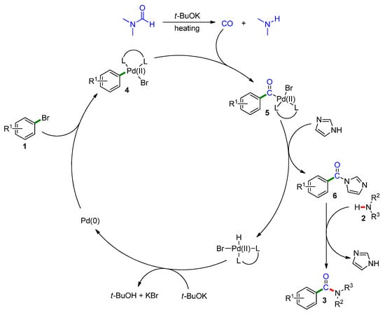 The reaction mechanism proposed by the authors (Scheme 3) clearly highlights the role played by the Pd(OAc)2/dppf catalytic system, as well as that of both t-OBuK and imidazole as, respectively, base and additive. Since it is well established that DMF, under heating, may decompose to yield carbon monoxide and dimethylamine in the presence of base [29], potassium t-butoxide could promote this transformation under the MW heating. The resulting CO may then enter into the palladium catalytic cycle: after the oxidative addition step of a palladium(0) species to the aryl bromide 1, the resulting arylpalladium(II) complex 4 can coordinate the in-situ-generated CO, to give the corresponding aroylpalladium(II) intermediate 5. At this point, imidazole can give a nucleophilic substitution to the acyl moiety of intermediate 5, affording a hydropalladium(II) complex and aroylimidazole 6. The subsequent nucleophilic substitution of amine 2 to the aroylimidazole 6 afforded the final product 3, while a potassium t-butoxide-assisted reductive elimination of the hydropalladium(II) complex gave the Pd(0), which started a new cycle. From this mechanism, it is clear that the formation of dimethylamine as a by-product of DMF decomposition could represent an issue for the formation of the desired products 3, as it could compete with the amine 2 in the nucleophilic substitution step to the aroylimidazole 6; in order to avoid this parasitic reaction, the amine 2 was used in large excess (4.0 equiv.) with respect to the aryl bromide 1. Moreover, the use of dppf as a ligand rather than of a monodentate phosphine ligand was due to the fact that bidentate ligands are able to inhibit the formation of less-active palladium(II)-carbonyl complexes.