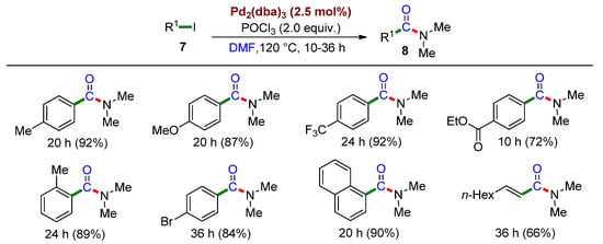 In the same year, Hiyama and Nozaki reported, instead, a CO-free aminocarbonylation of aryl and alkenyl iodides 7, using DMF not as a simple source of CO but of the entire amide group [30]. In more detail, the reactions were carried out in the presence of Pd2(dba)3 (2.5 mol%) as the catalytic system under ligand-free conditions, in the presence of POCl3 (2.0 equiv.) as an additive and DMF as the usual solvent and reagent, at 120 °C for 10–36 h, affording the corresponding N,N-dimethylamide products 8 in high yields (Scheme 4). Compared to the work of Hallberg, Alterman et al., such protocol showed several advantages: first, working in the absence of any ligand, the total cost of the process was lower and also the purification of the coupling products was easier. Second, the substrate scope was broader; reactions worked very well on aryl iodides bearing both electron-donating and electron-withdrawing groups, while only one example was performed on alkenyl iodides. On the other hand, there are also some drawbacks: the use of iodides as coupling partners, which are more expensive than the corresponding bromides; the absence of MW irradiation, thus requiring high temperatures for long reaction times; the possibility of synthesizing only N,N-dimethylamides, due to the absence of other amines as coupling partners.