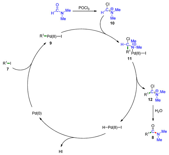 Interestingly, the reaction mechanism proposed by the authors for this aminocarbonylative protocol (Scheme 5) was quite different from that of Hallberg, Alterman et al., although no studies were actually carried out in order to corroborate it. First of all, Pd(0) can give an oxidative addition to the organic iodide 7, affording the corresponding organopalladium(II) 9; at the same time, DMF can give the corresponding iminium salt 10 by reaction with POCl3 (Vilsmeier reagent) [31]. Such mechanism then proceeded through a Heck-type path, with a carbopalladation of 9 to the C=N double bond of iminium salt 10, affording the intermediate 11, followed by dehydropalladation to give a new organoiminium salt 12 and a hydropalladium(II) complex. Hydrolysis of 12 afforded the final N,N-dimethylamide product 8, while the reductive elimination of hydropalladium(II) complex afforded the starting Pd(0) species.
