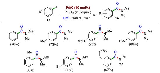 More recently, the palladium-catalyzed carbonylation involving DMF as a CO surrogate have been widely investigated by Bhanage et al. Their first study on this topic was reported in 2008: starting from the previous investigation of Hiyama and Nozaki, the aminocarbonylation of aryl iodides 13 with DMF, acting as the source of both CO and N,N-dimethylamino group, was performed here using commercial Pd/C as catalyst [32]. Reactions were carried out with a Pd loading of 10 mol%, 2.0 equiv. of POCl3 as an additive, in DMF at 140 °C for 24 h, affording the corresponding N,N-dimethylamide products 14 in 63–76% yields (Scheme 6). Therefore, the experimental conditions were very similar to the previous work of Hiyama and Nozaki, although a four times larger catalytic loading was used here (2.5 mol% of Pd2(dba)3 vs. 10 mol% of Pd/C). One of the most critical points of this work was the determination of the true mechanism (heterogeneous vs. homogeneous) of the catalyst: ICP-AES analysis revealed that a significant amount of palladium species had leached into the solution, thus suggesting the possibility of a homogeneous reaction mechanism. If the possibility of thermal redeposition at 140 °C at the end of the reaction allowed for a moderate catalyst reusability (up to three consecutive cycles), the problem of metal contamination of the coupling products (typically observed by using homogeneous metal catalysts) still remains unsolved. A further limitation of this protocol is related to the yields of N,N-dimethylamide products, which were generally lower if compared of those of the previous work of Hiyama and Nozaki (63–76% of 14 vs. 72–92% of 8).
