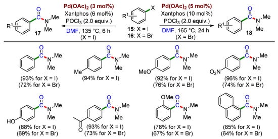 In a subsequent study, Bhanage et al. proposed, instead, the aminocarbonylation of aryl iodides 15 and bromides 16 with DMF as a CO source [33]. In this case, authors returned to the use of a homogeneous catalytic system, i.e., Pd(OAc)2 in combination with Xantphos as a ligand. In the case of iodides 15, carbonylation was carried out with 3 mol% of Pd(OAc)2, 6 mol% of Xantphos, 2.0 equiv. of POCl3, in DMF at 135 °C for 6 h, affording the corresponding N,N-dimethylbenzamide products 17 in 78–93% yields; with less reactive bromides 16, higher catalytic loading (5 mol% of Pd(OAc)2, 10 mol% of Xantphos) and temperature (165 °C) and longer reaction times (24 h) were required to obtain amides 18 in 64–76% yields (Scheme 7). The protocol proved to be effective over a broad substrate scope, bearing electron-donating or electron-withdrawing groups in the para or ortho positions. It is worth emphasizing that, in this study, no mechanistic investigations were performed, although we can still hypothesize a similar path to that described by Hiyama and Nozaki (see Scheme 5).