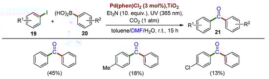 Despite aminocarbonylation representing the most common class of Pd-catalyzed carbonylation involving DMF as a CO surrogate, more recently a photocatalytic carbonylative Suzuki–Miyaura coupling of aryl iodides 19 with aryl boronic acids 20 was achieved by Li et al. [34]. Under the optimized experimental conditions, reactions were carried out with 2.0 equiv. of boronic acid 20, in the presence of Pd(phen)Cl2 (3 mol%) and TiO2 as the catalysts, 10 equiv. of Et3N as the base, under UV irradiation at 365 nm and a CO2 atmosphere, in a toluene/DMF/H2O solvent mixture, affording diaryl ketones 21 (Scheme 8). The substrate scope was actually very limited, affording a maximum yield of 45% of diaryl ketones 21, since this study only represents a proof-of-concept, rather than an extended synthetic investigation: in our opinion, further investigation would be needed to increase the impact of this protocol in the context of organic chemistry.