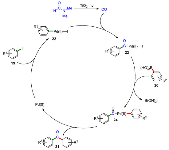 A simplified reaction mechanism proposed by the authors for this carbonylative transformation is depicted in Scheme 9. Under UV irradiation, TiO2 allowed for the photocatalytic decomposition of DMF to CO, which was then involved in a carbonylative Suzuki–Miyaura coupling promoted by the palladium species: the starting Pd(0) species gave oxidative addition on the aryl iodide 19, affording the arylpalladium(II) intermediate 22; then, the photocatalytically in-situ-generated CO was coordinated by the Pd(II) of intermediate 22, generating the corresponding aroylpalladium(II) complex 23; the subsequent Et3N-promoted transmetalation of arylboronic acid 20 gave a new Pd(II) intermediate 24, which generated the final diaryl ketone product 21 and the starting Pd(0) species after the reductive elimination step. It is worth emphasizing that the modest yields of the carbonylated products 21 were due to the modest amounts of CO generated via the photocatalytic decomposition of DMF, as well as to the concomitant path of the standard Suzuki–Miyaura coupling, affording the corresponding not carbonylated biaryl products.