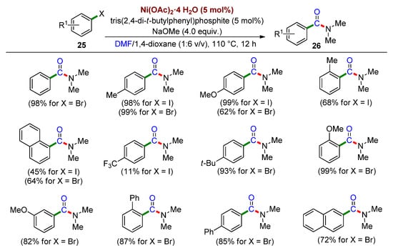The first study in this field was reported in 2007 by Lee and co-workers, who described the aminocarbonylation of aryl iodides/bromides 25, using DMF as the source of CO and N,N-dimethylamino groups [37]. After an extended optimization of the experimental conditions, where different nickel species and ligands were tested, reactions were performed with Ni(OAc)2·4 H2O (5 mol%) and tris(2,4-di-t-butylphenyl)phosphite (5 mol%) as a catalytic system, NaOMe (4.0 equiv.) as a base, in a DMF/1,4-dioxane (1:6 v/v) mixture, at 110 °C for 12 h, affording the corresponding benzamides 26, in most cases in very good yields (Scheme 10). Interestingly, the protocol showed a broad substrate scope, although aryl halides bearing electron-withdrawing functional groups worked worse than systems with electron-donating groups. By comparing this protocol with the analogous Pd(OAc)2-catalyzed studies described in Section 2.1, in general we found a quite similar performance (in terms of reaction times and product yields), but with the difference that Ni(OAc)2·4 H2O is much less expensive than Pd(OAc)2.