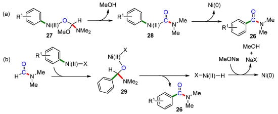 Concerning the reaction mechanism, the authors excluded the occurrence of a path similar to that previously reported by Hallberg, Alterman et al. for the analogous palladium-catalyzed aminocarbonylation (see Scheme 3). In fact, by adding imidazole and benzylamine as a further coupling partner, no formation of the corresponding N-benzyl amide was found. Therefore, the proposed mechanism was depicted in Scheme 11, consisting of two possible pathways: the first one, starting from the nickel-coordinated alkoxide-DMF adduct 27, which could then give elimination of MeOH and subsequent formation of a nickel amido intermediate 28, affording the final amide product 26 by through reductive elimination (Scheme 11a); the other one, working through an aryl group insertion into nickel-coordinated DMF to give the intermediate 29, followed by a β-hydrogen elimination step (Scheme 11b).