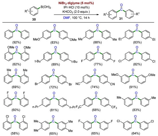 More recently, a different nickel-catalyzed carbonylative reaction was reported: Lu, Liu and co-workers described the carbonylative homo-coupling of aryl boronic acids 30 with DMF as a CO surrogate [39]. Interestingly, in the optimization of the experimental conditions several metals have been tested, including FeCl3, CuCl2 and CoCl2, but no reaction occurred; among nickel species, the best conditions were obtained in the presence of NiBr2·diglyme (5 mol%) as catalytic precursor and bis(2,6-diisopropylphenyl)imidazol-2-ylidene hydrochloride (10 mol%) as a ligand. Reactions were carried out in the presence of 2.0 equiv. of KHCO3 as base, in DMF at 100 °C for 14 h, affording the corresponding symmetric diaryl ketones 31 in a 52–92% yield (Scheme 12). The protocol was successfully applied to substrates with different stereo-electronic properties, bearing electron-poor or electron-rich functional groups in the para, meta and/or ortho positions. One of the major drawbacks of this synthetic procedure was the possibility of application only to the synthesis of symmetric diaryl ketones: in fact, no attempt to prepare asymmetric ketones with the combined use of two different aryl boronic acids was reported.