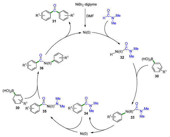 The authors also proposed a plausible reaction mechanism for this transformation (Scheme 13). First of all, DMF worked as a reducing agent [40] allowing for the reduction of the starting Ni(II) species to Ni(0), which gave, then, an oxidative addition on the C–H bond of DMF to give intermediate 32. A base-assisted transmetalation of aryl boronic acid 30 afforded the arylnickel(II) complex 33, which then led to the formation of the starting Ni(0) species and N,N-dimethylbenzamide intermediate 34 after reductive elimination. At this point, a new oxidative addition of Ni(0) on the C–N bond of 34 gave the corresponding Ni(II) intermediate 35, subjected to a further transmetalation of aryl boronic acid 30 giving the complex 36; the final reductive elimination afforded the desired ketone 31 and the starting Ni(0) complex.