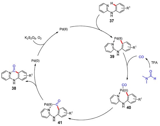 The reaction mechanism proposed by the authors (Scheme 15) clearly highlights the role played by the Pd(OAc)2 catalyst. First of all, the coordination of the palladium(II) species to the substrate molecule 37 followed by the C−H activation step on the ortho position of the benzene ring afforded the Pd(II) complex 39. The combined effect of high temperatures and trifluoroacetic acid allowed for the decomposition of DMF and subsequent in-situ release of CO, which was then coordinated to complex 39, giving the metal carbonyl intermediate 40. The insertion of carbon monoxide into the Pd−C bond gave the acylpalladium(II) complex 41, followed by the reductive elimination step which afforded the final heterocyclic product 38 and a palladium(0) species. The occurrence of both K2S2O8 and O2 as oxidants was mandatory to close the catalytic cycle, since they allowed for the re-oxidation of Pd(0) to the starting Pd(II) catalyst. In order to confirm that DMF was the effective source of CO, the authors also performed some tests of carbonylative cyclization using a 13CO-labeled DMF.