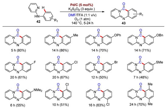 A possible way to improve the sustainability and the impact of palladium-catalyzed cyclocarbonylative reactions is represented by the use of supported catalysts, as they can be easily recovered and reused many times, thus avoiding the problematic metal contamination of cyclization products which typically occurred with homogeneous catalytic systems [49,50,51,52]. In this context, Wu et al. developed, in 2015, an appealing improvement of their previous work on the carbonylative cyclization of N-arylpyridin-2-amine derivatives 42 by C−H activation/ annulation with DMF as a CO surrogate, using Pd/C as supported catalyst [53]. It is worth emphasizing that the authors also tested the use of Cu(acac)2 as a co-catalyst during the optimization of the reaction conditions; since direct C−H bond arylation of (hetero)arenes are often performed with bimetallic Pd/Ag [54] or Pd/Cu [55] catalytic systems, the use of Cu(acac)2 in combination with Pd/C could help the starting of the C−H activation step. However, in this specific case no improvements in the quinazolinones 43 yields were observed in the presence of copper species, so its use was then set aside in the optimized experimental conditions. In fact, reactions were carried out by using commercial 10 wt.% Pd/C (5 mol%) as the catalyst, 3.0 equiv. of K2S2O8 and O2 (1 atm) as oxidizing agents, DMF as both CO source and solvent and CF3COOH as the co-solvent, at 140 °C for 5–24 h (Scheme 16). The substrate scope was quite similar to that of the previous study: reactions were carried out on N-arylpyridin- 2-amines 42 with both electron-donating and electron-withdrawing groups on the benzene ring, affording the corresponding quinazolinones 43 in moderate-to-good yields. Notably, this new protocol generally showed lower reaction times, in particular in the case of electron-rich substrates.