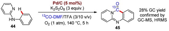 Pd/C-catalyzed carbonylative cyclization of N-phenyl pyridin-2-amine 44 using carbonyl-13C-labeled DMF: synthesis of 11H-pyrido[2,1-b]quinazolin-11-one-11-13C 45.