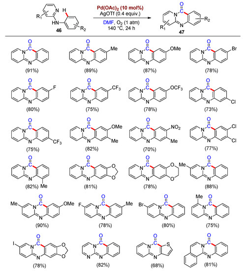 Although both protocols of Wu and co-workers were characterized by a quite extended substrate scope, they were limited to the synthesis of quinazolinones as the only heterocycles. Due to the above-mentioned advantages of DMF, it could be interesting the development of new Pd-catalyzed carbonylative cyclization protocols involving DMF as a CO surrogate for the synthesis of other highly functionalized heterocycles. In this context, in 2016 Das et al. described an unprecedented Pd/Ag bimetallic catalysis for the synthesis of pyrido-fused quinazolinones and phenanthridinones by aerobic cyclocarbonylation in the presence of DMF as the carbon source [58]. Concerning the catalytic system, several metal species were tested in the optimization of the reaction conditions. First, keeping Pd(OAc)2 as the main catalyst, many silver compounds were tested as co-catalysts (i.e., Ag2CO3, Ag2O, AgOAc, Ag2SO4, AgF, AgNO3, AgSbF6, AgTFA and AgOTf); although in almost all cases the reaction occurred, the best performance in terms of yields were found using AgOTf. Then, in the presence of AgOTf as the co-catalyst other metal catalysts were tested: Ni(OAc)2, affording the heterocyclic products in low yields, Cu(OAc)2 and Co(OAc)2, which instead gave no reaction. Moreover, the synergistic effect of Pd and Ag catalysis was further confirmed by the absence of any reaction using only Pd(OAc)2 or AgOTf. Therefore, under the optimized experimental conditions N-arylpyridin-2-amines 46 and 2-arylanilines 48 were treated with Pd(OAc)2 (10 mol%) and AgOTf (0.4 equiv.), in DMF acting as both reagent and solvent, under O2 atmosphere at 140 °C for 24 h, to give quinazolinones 47 and phenanthridinones 49, respectively.