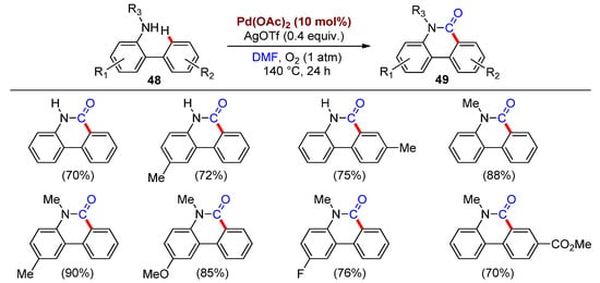 Synergistic Pd/Ag-catalyzed carbonylative cyclization of N-methyl 2-arylanilines 48 with DMF as a CO surrogate for the synthesis of phenanthridinones 49, reported in 2016 by Das et al. [58]. For each heterocyclic carbonylated product, the yield after column chromatography purification is reported in brackets.