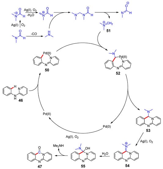 Starting from all these considerations, Das et al. proposed a plausible mechanism for their protocols, well showing the central role of the Pd/Ag synergistic catalysis (Scheme 20). First of all, the starting palladium(II) species was coordinated to the nitrogen atom of the pyridine ring, followed by the C−H bond activation step on the ortho position of the benzene ring to afford the Pd(II) complex 50. Simultaneously, a sequential decarbonylation, nucleophilic addition and elimination of DMF, allowed by a silver(I) catalysis and in the presence of O2 as an oxidizing agent, generated the iminium species 51. Then, the palladium(II) intermediate 50 gave a nucleophilic addition to the iminium species 51, producing the seven-membered palladacycle intermediate 52; the subsequent reductive elimination of such intermediate generated the heterocyclic intermediate 53 and a Pd(0) species, which was re-oxidized into the starting Pd(II) in order to close the catalytic cycle by the action of silver(I) and atmospheric O2. The Ag- and O2-assisted oxidation of 53 produced the iminium salts 54, which, upon hydrolysis, furnished the final product with the elimination of dimethylamine.