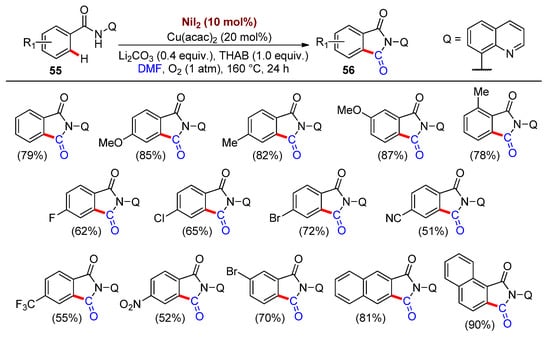 Synthesis of phthalimides 56 by carbonylative cyclization of aromatic C(sp2)−H of amides 55 using DMF as CO surrogate, promoted by the synergistic action of NiI2 as the main catalyst and Cu(acac)2 as co-catalyst, reported in 2015 by Ge and co-workers [63]. For each heterocyclic carbonylated product, yield after column chromatography purification is reported in brackets.