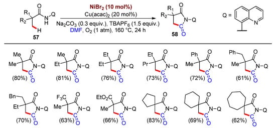 In 2015, Ge and co-workers reported the carbonylative cyclization of aromatic C(sp2)−H and aliphatic C(sp3)−H bonds of amides 55–57 using DMF as a CO surrogate, promoted by the synergistic action of Ni as the main catalyst and Cu as co-catalyst, to give phthalimides 56 and succinimides 58 as the final products [63]. Concerning the cyclocarbonylation of aromatic amides 55, reactions were carried out with NiI2 (10 mol%) as the main catalyst, Cu(acac)2 (20 mol%) as co-catalyst, Li2CO3 (0.4 equiv.) as a base, tetraheptylammonium bromide (THAB, 1.0 equiv.) as an additive, in DMF as both reagent and solvent under an O2 atmosphere (1 atm), at 160 °C for 24 h (Scheme 21). Under these conditions, benzamides bearing different functional groups were successfully treated to give the corresponding phthalimide products 56: in particular, substrates with electron-donating substituents (4-MeO, 4-Me, 3-MeO, 2-Me) afforded the corresponding products in higher yields compared to those bearing electron-withdrawing substituents (4-F, 4-Cl, 4-Br, 4-CN, 4-CF3, 4-NO2, 3-Br). Interestingly, reactions took place also with α- and β-naphthamides, affording the corresponding tricyclic imides in excellent yields, while no reactions occurred with heteroaromatic amides. Carbonylative cyclization of aliphatic amides 57 were instead carried out with NiBr2 (10 mol%) as the main catalyst, Cu(acac)2 (20 mol%) as the co-catalyst, Na2CO3 (0.3 equiv.) as base, tetrabutylammonium hexafluorophosphate (TBAPF6, 1.5 equiv.) as additive, in DMF acting as both reagent and solvent, under O2 atmosphere (1 atm), at 160 °C for 24 h (Scheme 22). Working with these optimized experimental conditions, 2,2-disubstituted propanamides bearing either linear or cyclic chains were successfully converted into the corresponding succinimides 58 in good-to-excellent yields: these results indicated a high site-selectivity in functionalizing the β-C(sp3)−H bond of the methyl group, rather than γ- or δ-C(sp3)−H bonds, showing that the formation of a five-membered ring is favored over the six- or seven-membered rings.