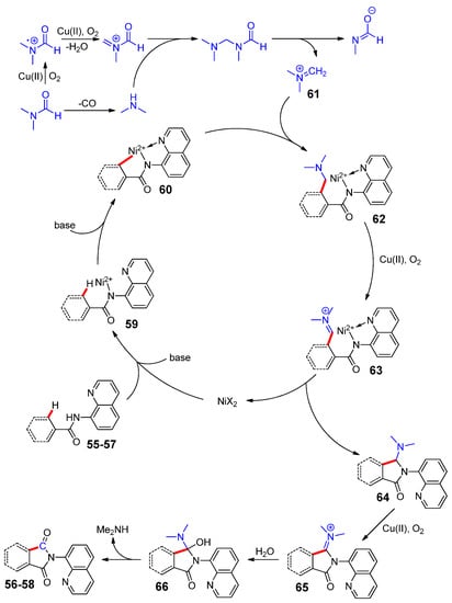 Ge and co-workers proposed a plausible mechanism for their protocol, which was in agreement with all the experimental evidence, showing the central role of the nickel catalysis in combination with copper acting as a co-catalyst (Scheme 23). First of all, the starting nickel(II) species was coordinated under basic conditions by the nitrogen atom of the amide substrate, affording the nickel(II) complex 59. Then, the C−H activation step by the nickel(II) occurred (on the ortho-C(sp2)−H bond in the case of benzamides and on the β-C(sp3)−H bond in the case of 2,2-disubstituted propanamides), affording the cyclometalated intermediate 60. Simultaneously, the iminium ion intermediate 61 was generated in-situ from DMF by a sequential decarbonylation, nucleophilic addition and elimination process promoted by copper(II) species in the presence of O2 as the external oxidant [64,65,66]. The subsequent nucleophilic addition of 60 to the iminium ion 61 produced the intermediate 62, which was then oxidized to the iminium salts 63 by the synergistic action of copper(II) and atmospheric O2 as oxidizing agents. The intramolecular nucleophilic addition of the iminium salts 63 afforded the starting nickel(II) species and the intermediate 64, which was then oxidized and hydrolyzed to yield the final product.