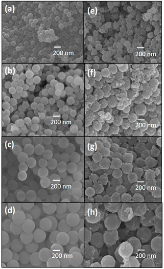 The surface morphologies of the silica microspheres (SSx, where x refers to the average diameter), with average particle sizes of 100, 200, 300, and 400 nm (designated as SS100, SS200, SS300, and SS400, respectively), were analyzed via scanning electron microscopy (SEM; Figure 1a–d); the processing parameters and diameter ranges are listed in Table S1. A hydrothermal process was then used to apply a TiO2-shell over each SSx core, using titanium (IV) butoxide (TBT) as the TiO2 precursor, to give the corresponding core-shell SiO2-TiO2 microspheres (TSx). The surface morphologies of TS100, TS200, TS300, and TS400 were also examined via SEM (Figure 1e–h), revealing rougher surfaces than those of their corresponding SS100, SS200, SS300, and SS400 cores. In addition, it is clear that the particle sizes increased by 20–60 nm upon addition of the TiO2-shells, indicating that the thicknesses of the shells are approximately 10–30 nm. X-ray diffraction (XRD) analyses also confirmed the successful coating of the SSx with the desired TiO2 species. Specifically, comparing the XRD patterns of the SSx and TSx (Figure S1a,b, respectively) verified the presence of weak but characteristic anatase peaks in the latter.