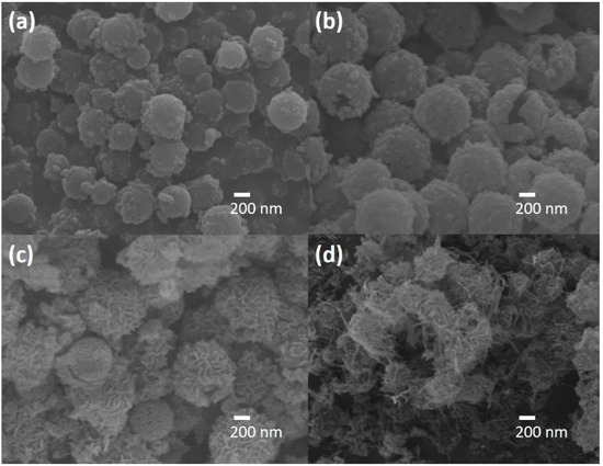 SEM images of the prepared hollow TiO2 microspheres (hTSx-y; x = average diameter, y = pH used during the hydrothermal process): (a) hTS200-8, (b) hTS200-10, (c) hTS200-12, and (d) hTS200-14.