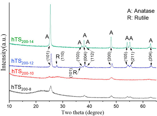 X-ray diffraction (XRD) patterns of the hTS200-8, hTS200-10, hTS200-12, and hTS200-14 samples.