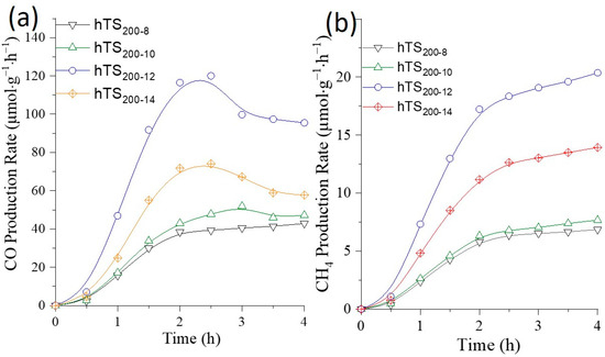 The effects of the hydrothermal pH on the actual performance of the hTS200-8, hTS200-10, hTS200-12, and hTS200-14 photocatalysts in CO2PR were subsequently examined (Figure 5). Both the CO and CH4 production rates increase with an increase in the processing pH up to a pH > 12. Owing to their poor anatase crystallinities (Figure 3), hTS200-8 and hTS200-10 exhibit much poorer overall performances than the other photocatalysts. Although hTS200-14 exhibits the highest level of crystallinity, its inferior band gap and SSA to those of hTS200-12 result in its CO and CH4 production efficiencies being lower than those of hTS200-12. The CO and CH4 production efficiencies of the photocatalysts follow the order: hTS200-12 >> hTS200-14 >> hTS200-8 > hTS200-10, which coincides with the variations in their band gaps and SSAs (Table S2).
