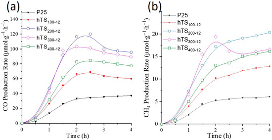 Employing the optimal catalyst processing pH (12), the effect of the cavity sizes of the hTS100-12, hTS200-12, hTS300-12, and hTS400-12 photocatalysts (i.e., the macropore size) on their CO2PR activity was evaluated in our homemade CO2PR system. Figure 6 shows the CO and CH4 production rates achieved during irradiation in the presence of the photocatalysts; CO is the major product. The CO/CH4 production rates achieved by the hTSx-12 photocatalysts increase during the first 2 h, owing to irradiation-induced catalyst activation. Upon reaching their maximum values after approximately 2 h of irradiation, the CO production rates leveled off and those of CH4 increased at a much slower rate; the CO and CH4 production rates with hTS200-12 and hTS300-12, respectively, first achieved decrease before levelling off. The results in Figure 5 show a similar trend. After 4 h, the maximum CO yields obtained using commercial P25, hTS100-12, hTS200-12, hTS300-12, and hTS400-12 were 37.2, 60.1, 95.2, 89.7, and 77.4 µmole/g h, respectively. The hTS200-12 sample achieved the highest CO production rate, which could be due to various factors, including its light utilization efficiency, SSA, mass transfer abilities, and catalyst utilization rate. For example, it is well known that the SSA of particles decrease with an increase in their size; in contrast, the convection and diffusion rates of products/reactants increase and decrease, respectively, with an increase in the particle size. Consequently, the optimized performance was achieved using microspheres with a diameter of 200 nm. Notably, all the hTSx-12 photocatalysts outperformed the commercial P25 nanoparticles, which emphasizes the advantages of applying hollow microspheres as photocatalysts for CO2PR.