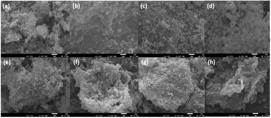 SEM images of the hTS200-12/graphene composites (hTS200-12Gz; z = wt% of graphene): hTS200-12Gz containing (a) 5, (b) 30, (c) 45, (d) 50, (e) 60, (f) 70, (g) 80, and (h) 90 wt% graphene.