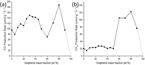 Most of the hTS200-12Gz photocatalysts exhibited stable photocatalytic activity between 2 and 4 h; however, to better evaluate the effect of the graphene amount in the composites on the CO and CH4 production rates, the activities of the composites were examined at the fourth hour (Figure 8a,b). Briefly, with an increase in the graphene content from 0 to 30 wt%, the CO production rate reaches its maximum value (150.5 µmole/g h); this value is 1.56 times greater than that achieved using hTS200-12. This result can be attributed to a reduction in the extent of agglomeration of hTS200-12 with an increase in the graphene content. This same graphene content range has a negligible effect on the CH4 production rate, while a further increase in the graphene content to 60 wt% results in a dramatic increase in the production of CH4 but a decrease in the production of CO. Figure 8a,b also shows that the CO production rate is more sensitive to a change in the composite graphene content than the CH4 production rate. There are three possible reasons for this observation: firstly, it has been reported that the band gap of TiO2/graphene can decrease with an increase in the graphene content or bond strength between graphene and TiO2 [31,32]; the bandgap is key when considering product selectivity [5,12,15]. Secondly, improving the degree of dispersion of hTS200-12 on graphene can result in an overall higher catalytic activity potential for the composites. Thirdly, it has been reported that TiO2 can cause the photodegradation of graphene oxide under irradiation [33], or the formation of Ti-C and Ti-O-C bonds between the C atoms of graphene and Ti atoms in TiO2 [34], which could lead to changes in the photocatalytic activity of the composite. According to Akhavan et al., the D, G, and 2D bands in the Raman spectrum of graphene oxide change as a function of the irradiation time [33]; this suggests that photodegradation of graphene could also occur for our hTS200-12Gz photocatalysts. This hypothesis was in agreement with the long-term stability test of hTS200-12G80 (Figure S6), which indicates the decay on both CO and CH4 production rates. In addition, these three factors can influence each other; however, overall, changes in the CO/CH4 production rates are correlated. Notably, using a graphene mass fraction of 80 wt% in the composite photocatalyst resulted in optimal CO (187.9 µmole/g h; twice that achieved with hTS200-12) and CH4 (6 times that achieved with hTS200-12) production rates, which could be attributed to the excellent dispersion of hTS200-12 on graphene at this ratio.