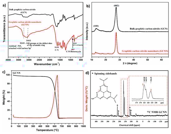 The transformation of urea into graphitic carbon nitride nanosheets (GCNN) was conducted via thermal treatment and was confirmed by FTIR, XRD, TGA and 13C NMR, as shown in Figure 1.