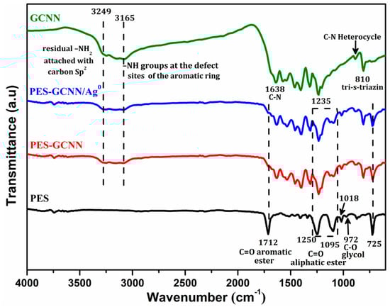 FTIR spectra of PES, PES-GCNN, PES-GCNN/Ag0 10 and GCNN.