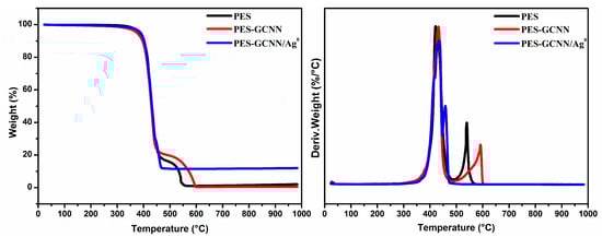 TGA and DTG thermogarms of PES, PES-GCNN, PES-GCNN/Ag0 10.