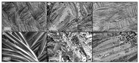 SEM examinations were conducted to investigate the morphology of the textile-based catalyst and GCNN/Ag0 degree of dispersion onto the PES surface. SEM micrographs of textile-based catalysts are given in Figure 6. Pristine PES exhibited a well ordered surface, which is composed of extended, intertwisted and knotted microfibers. SEM micrographs of the elaborated PES-GCNN sample clearly displayed a complete change in the surface morphology, going from a microsmooth morphology for pristine PES (Figure 6a,d) to a microrough morphology for PES-GCNN (Figure 6b,e), owing to the dip-coating process via ultrasonication that grants a full wrapping of PES microfibers with GCNN, thus improving the adhesion characteristics. Following the depostion of silver nanoparticles on the PES-GCNN surface via in situ reduction, SEM micrographs of PES-GCNN/Ag0 10 (Figure 6c,f) revealed similar roughnesss to that of the PES-GCNN sample, accompanied with the appearance of deposited silver nanoparticle (Ag0) onto its surface. The in situ deposited Ag0 mainly consisted of homogeneous and uniform quasi-spherical nanoparticles with no sign of aggregation (inset of Figure 6f). Herein, the preceding GCNN coating on the PES surface had the capability to enhance the compatibility and adhesion properties of PES fibers, thus allowing the homogeneous capture and deposition of Ag nanoparticles.