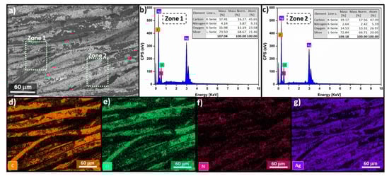 The energy dispersive X-ray (EDX) mapping analysis of the PES-GCNN/Ag0 10 fabric. (a) The explanation for subfigure is EDX Mapping, (b,c) the EDX spectrum of the PES-GCNN/Ag0 in two zones, and the EDX-mapping distribution of carbon (d), oxygen (e), nitrogen (f) and silver nanoparticles (g).