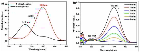 To evaluate the catalytic performance of various as-prepared PES-GCNN/Ag0 catalysts, reduction of 4-NP to 4-AP in the presence of excess NaBH4 was chosen as a model reaction. As it is well known, the light-yellow 4-NP aqueous solution (0.03 mM) exhibits an absorption peak at around 318 nm. After addition of NaBH4 (0.1 M), the color of the solution changes into greenish yellow and the maximum of this peak shifted to 400 nm due to the formation of 4-nitorphenolate ions (Figure 8a,e).