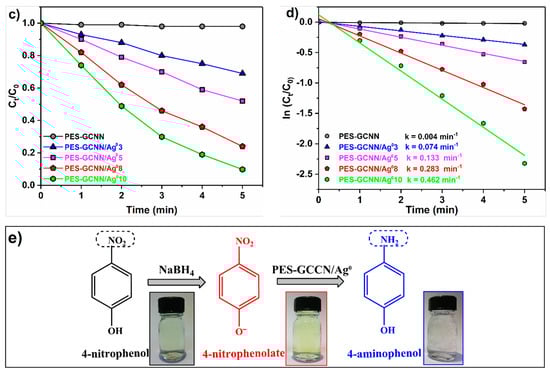 The changes related to the concentration (Ct/C0) of 4-nitorphenolate as a function of reaction time using a series of Ag0-containing catalysts is shown in Figure 8c,d. It should be noted that no conversion of 4-NP to 4-AP was obtained after 3 days in the absence of a catalyst. In addition, it can be seen from the obtained result that PES-GCNN is inactive for reduction of 4-nitorphenolate. In contrast, the addition of different amounts of Ag0, the catalytic activity of PES-GCNN/Ag0 samples gradually elevated with the increased amount of Ag NPs. This may suggest that Ag0 NPs can facilitate electron transfer from BH4− to 4-nitrophenolate, and thus lowers down the barrier of activation energy for reducing 4-NP to 4-AP.
