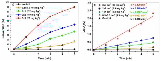 It was assumed that the surface porosity of fabric provides high sorption of both acceptor (4-NP) and donor (BH4−) species, which enhanced the rate of reduction by increasing electron transfer between the reacting substances []. This assumption was further reinforced by studying the effect of the surface of PES fabric coated with GCNN/Ag0 NPs on the 4-NP reduction process. Accordingly, we performed experiments varying the surface of catalyst (0.25, 1, 4 and 9 cm2), while reaction parameters such as concentration of 4-NP and NaBH4 were kept constant. Conversion profiles of the different surface of the catalyst are shown in Figure 9a. The rate constants for 0.25, 1, 4 and 9 cm2 are 0.032, 0.098, 0.154 and 0.462 min−1, respectively (Figure 9b). It was observed that the rate constant increased gradually with the increase in the surface of catalyst. The result means that: (1) the increase in the surface of the catalyst, the more active sites are generated, (2) a higher availability of surface for the adsorption of reacting species and (3) homogenous coating was obtained.