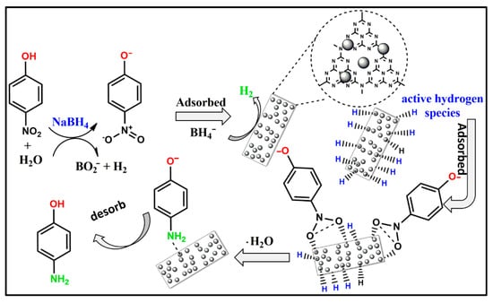 Nitro-aromatic compounds are considered one of the most frequent and stubborn organic pollutants found in industrial wastewaters due to their wide applications in several industries, such as pigments, dyes, plastics, pharmaceuticals, pesticides and fungicides []. Among them, 4-nitrophenol (4-NP) has been classified as a major pollutant by the US Environmental Protection Agency (EPA), owing to its potential toxicity toward human beings, fauna and flora []. On the contrary, 4-aminophenol (4-AP) (4-NP reductive derivative) is a valuable intermediate product used in the fabrication of paracetamol, clofibrate drugs, antioxygens and petroleum mixtures [,,]. Therefore, it is highly important to adopt a sustainable clean route for treating such compounds in aqueous medium. In this regard, catalytic hydrogenation of 4-nitrophenol into 4-aminophenol has been the focus of several studies during the recent years [,,].
