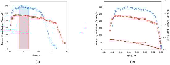 The rate of H2 production as a function of time (a) and sulfide concentration (b). The red square and the blue circle symbols represent the rate for catalyst prepared in reverse and normal order, respectively (see in the text). The bars in Figure 1a. shows the average rate calculated for the 200–400 min time region. The small filled squares gives the ratio of sulfide concentration to the total concentration of all sulfur containing anions.