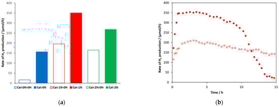 (a) Overall rate of H2 production for Cat-xN-(0H) before and after HTT (x: 0, 1, and 2) between 200 and 400 min, (b) overall rate of H2 production for Cat-1N before (-0H, empty marks) and after (filled marks) HTT as a function of time from a 0.13M Na2S/0.18 M Na2SO3 solution.