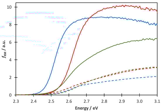 Kubelka-Munk functions of catalysts Cat-0N (solid blue), Cat-1N (solid red), Cat-2N (solid green), Cat-0N-0H (dashed blue), Cat-1N-0H (dashed red), and Cat-2N-0H (dashed green).