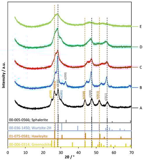 In order to understand the previously described effects, X-ray diffraction (XRD) measurements were performed on samples dried from suspensions of the catalysts (Figure 4). Freshly prepared ZnS and CdS were used as references. From the diffractograms, it was clearly shown that all the ZnS–CdS samples consisted of only sulfides and did not contain any hydroxides or oxides traces. The investigated catalysts consist of cubic sphalerite and hawleyite. The latter has a crystal structure similar to that of sphalerite. Furthermore, the shifts at different peaks vary, which proves that it originates from the modification of the crystal structure. However, the position of the peaks, mainly the ones belonging to CdS, shifted towards higher 2θ, while those belonging to sphalerite slightly moved towards lower 2θ. This suggests that the Zn2+ ions are partly substituted by Cd2+ in the hawleyite lattice and the Cd2+ ions are slightly replaced by Zn2+ in the sphalerite lattice.
