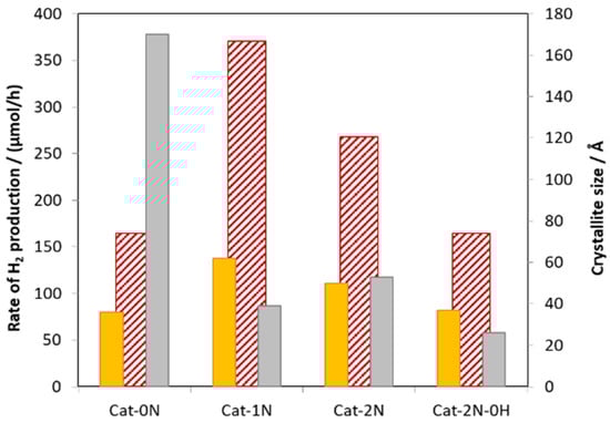 The overall rate of H2 production (red cross-hatch) and the crystallite size of ZnS (grey) and CdS (orange) for the Cat-xN-(0H) catalysts (x: 0, 1, and 2).